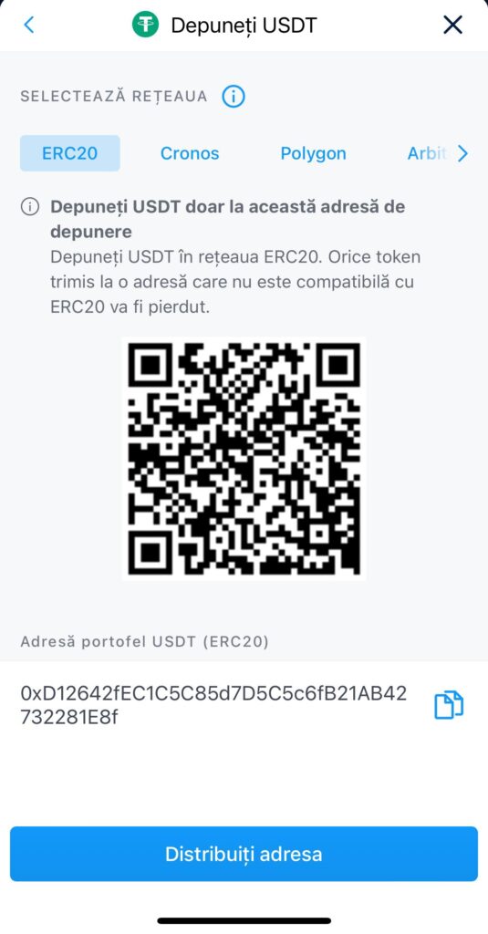 Odată ce faceți click pe el, veți vedea toate criptomonedele disponibile pe care le puteți folosi pentru a depune. Pentru acest exemplu, am decis să depunem stablecoin Tether (USDT). Găsiți USDT în listă și faceți clic pe butonul „depunere” din dreapta. Acesta este ecranul care va apărea: